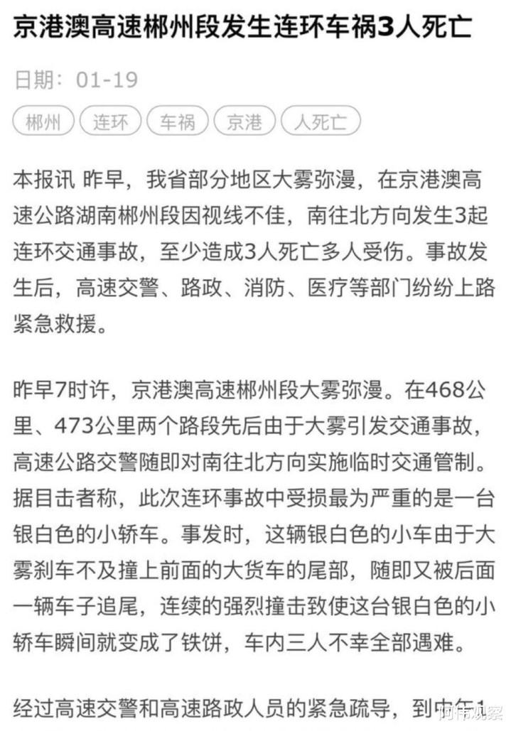 据悉,1月18日,京港澳高速公路湖南郴州段发生3起连环交通事故,至少造成3人死亡多人受伤。